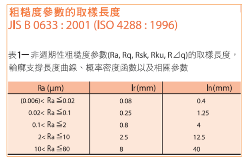 4. 根據求得的量測結果,若量測結果落在以表1 至3 求出的推定Ra 或Rz 的範圍內時,直接套用其切斷值,若超出 推定的Ra 或Rz 範圍,則將量測結果Ra 或Rz 變更為符合範圍的基準長度。