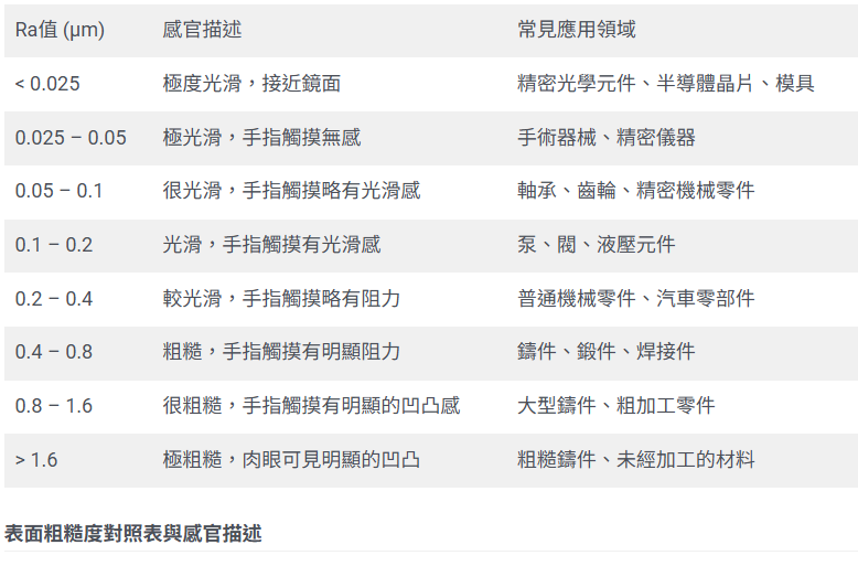 不同加工零件對於表面粗糙度的要求差異甚大,這取決於零件的功能、工作環境、工件材料、加工方法與成本的配合關係。
